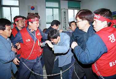• 김기태 위원장의 출근을 막는 경비인력에 맞서 조합원 400여 명이 규탄 집회를 열고 몸싸움을 벌임.