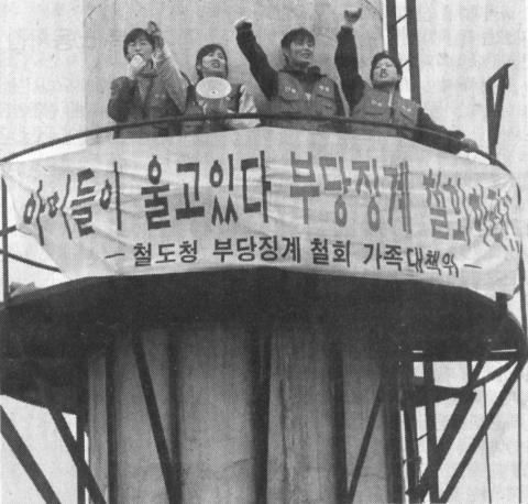 • 3·7 울진 대의원대회 참가 조합원 78명의 징계 회부 이후 공투본 지도부 가운데 중징계 대상자 9명에 대한 징계위원회가 개최됨. 이영익 등 공투본 지도부 4명은 징계위 출석을 거부하고 서울역 광고탑 위에 올라가 점거 농성을 벌임. “뇌물수수 부당징계 철도청장 구속하라!”는 내용의 현수막을 내걸고 출동한 공안원들과 대치하면서 5시간 동안 시위를 이어갔고 광고탑 아래 서울역광장에서는 조합원 50여 명이 철도청을 규탄하는 집회를 동시에 진행함. 한편 이날 징계위원회의 결과는 파면 5명, 해임 3명, 정직 3개월 1명이었음.