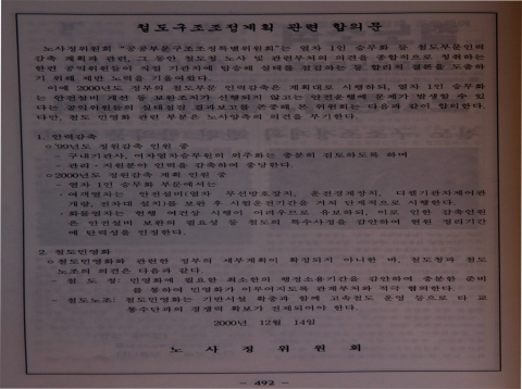 한편 전국철도노조는 1999년과 2000년 정부의 구조조정 계획에 따라 철도청의 인력감축에 동의해주고 ‘분할매각은 반대하나 통째 민영화는 찬성’하는 파업을 하겠다는, 그야말로 앞뒤가 안 맞는 행보를 가져갔다. 이는 2001년 노조 위원장 선거를 앞둔 상황에서 인력감축과 민영화 문제에 대해 어떻게든 투쟁하는 모습을 보여줄 수밖에 없었기 때문이다.